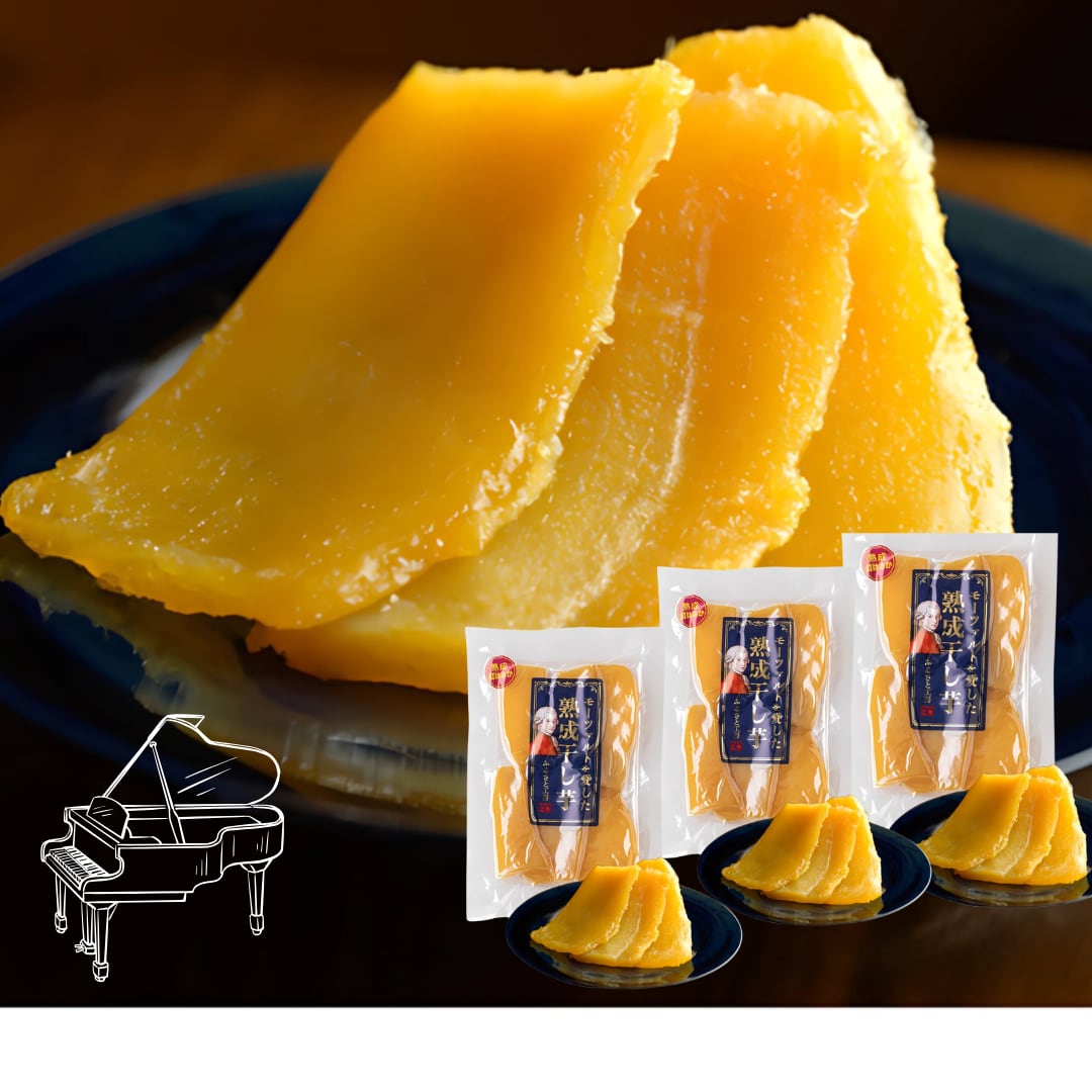 生芋にモーツァルトを響かせ、甘みを引き出す“音響熟成”を経て干し芋に加工。さらに職人が一枚一枚選別し、最高品質の干し芋だけがこの「モーツァルトを愛した干し芋」になります。